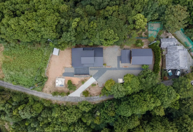 旅館由三棟建筑組成:一棟主樓用作接待處和公共空間,第二棟樓用作淋浴設施,第三棟樓用作客房。外觀方面,在利用部分現(xiàn)有建筑材料的同時,還采用了當?shù)氐腒ishu雪松板,隨著時間的推移,自然風化,使其看起來更加質(zhì)樸和粗獷,與古老的熊野居道一樣。